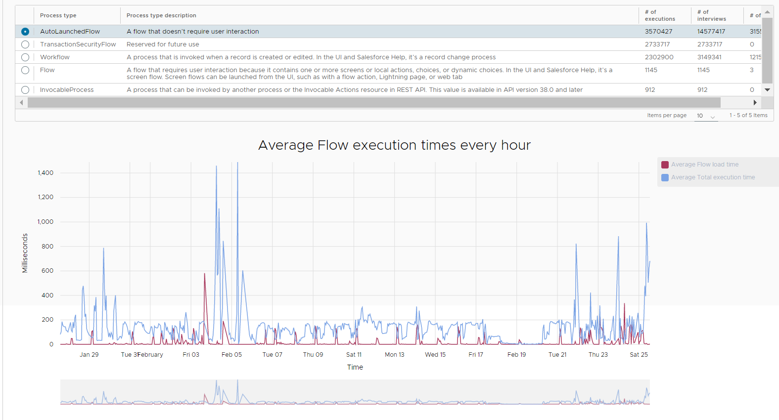 Monitor all the different Salesforce event types for selected timeframe and see graphs for selected event types. Raw data can be exported to CSV for selected time frame